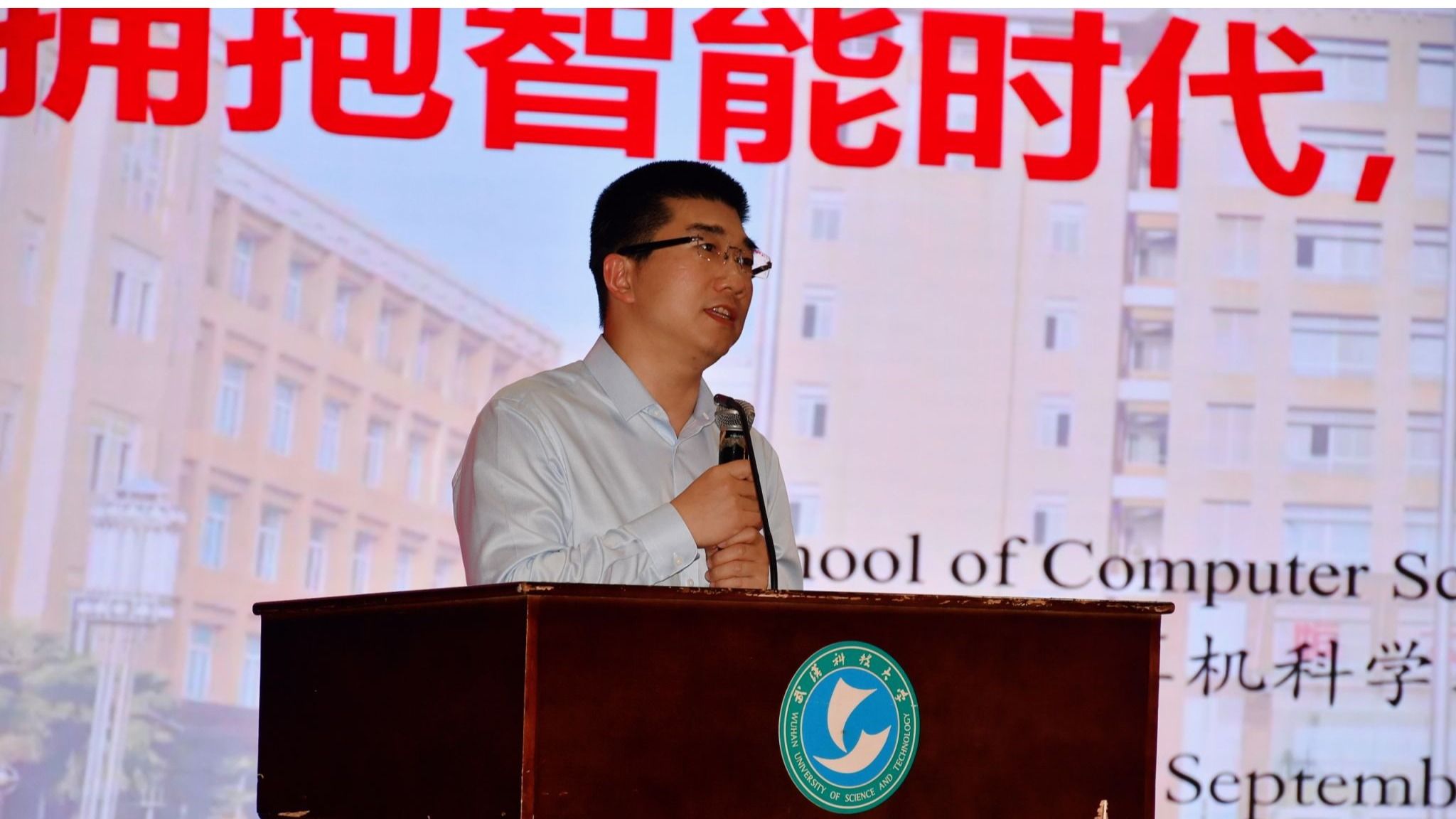 张凯以学院发展史为脉络,将37年建设历程浓缩为一部“学科进化史”。巨幕上动态呈现的时间轴清晰展示:1988年招收首届本科生,2019年计算机科学与技术、软件工程专业双双入选国家级一流本科专业并通过工程教育认证,2025年软科排名跃居全省第五。“从‘本科-硕士-博士’贯通培养体系,到覆盖人工智能、网络安全的全领域课程矩阵,我们为你们搭建了‘站在巨人肩膀上’的成长阶梯。”他指向屏幕上的学科架构图,台下新生纷纷举起手机记录这张“专业导航图”。