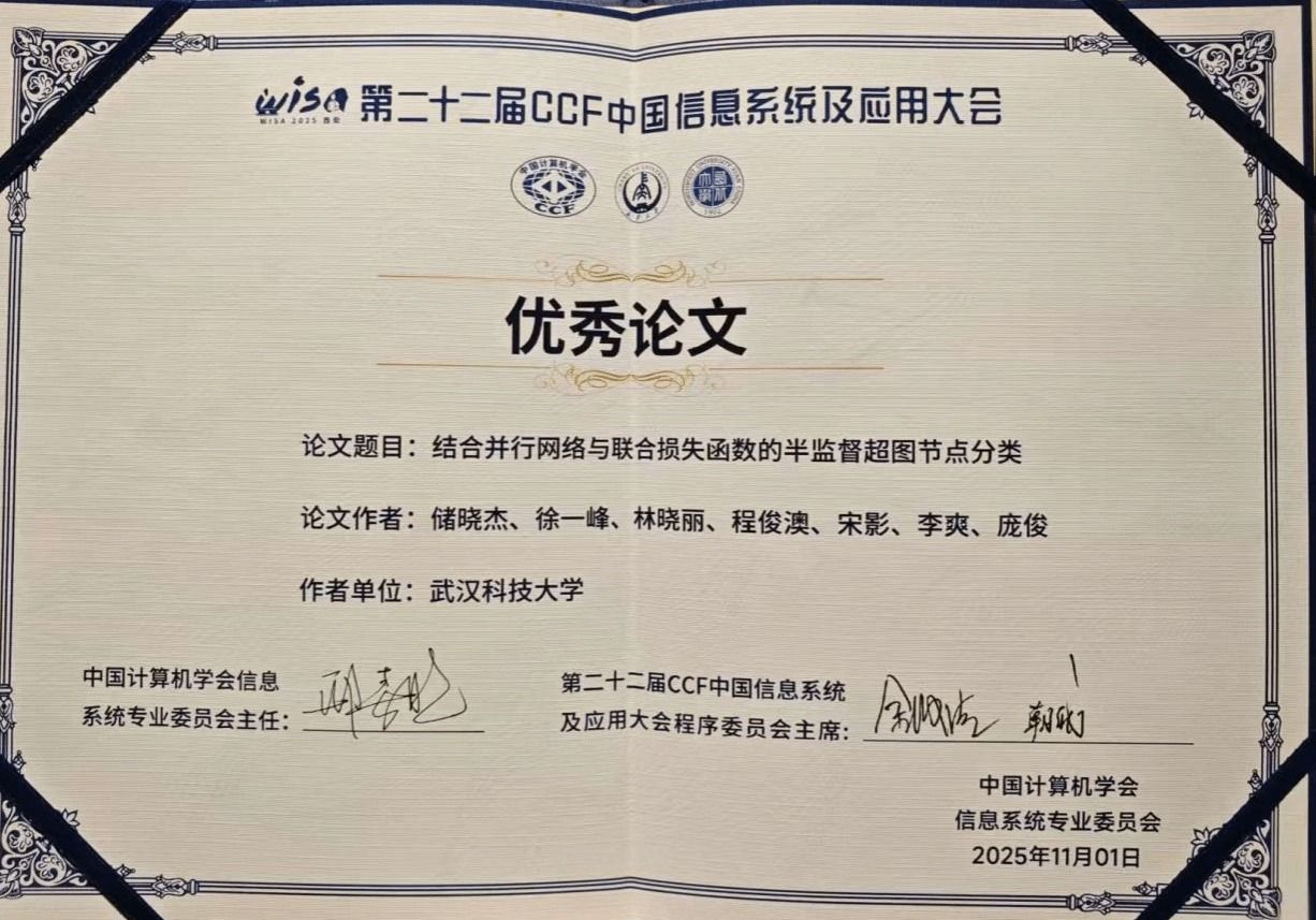 近日,在陕西省西安市举行的第二十二届CCF中国信息系统及应用大会(WISA 2025)上,我校365英国官网硕士研究生储晓杰、徐一峰、程俊澳、宋影、李爽在庞俊和林晓丽两位老师的指导下合作的论文《结合并行网络与联合损失函数的半监督超图节点分类》,荣获WISA 2025优秀论文。大会共收到研究论文投稿202篇,录用英文论文51篇,录用中文论文57篇。最终评选出1篇最佳论文,1篇最佳学生论文,6篇优秀论文。