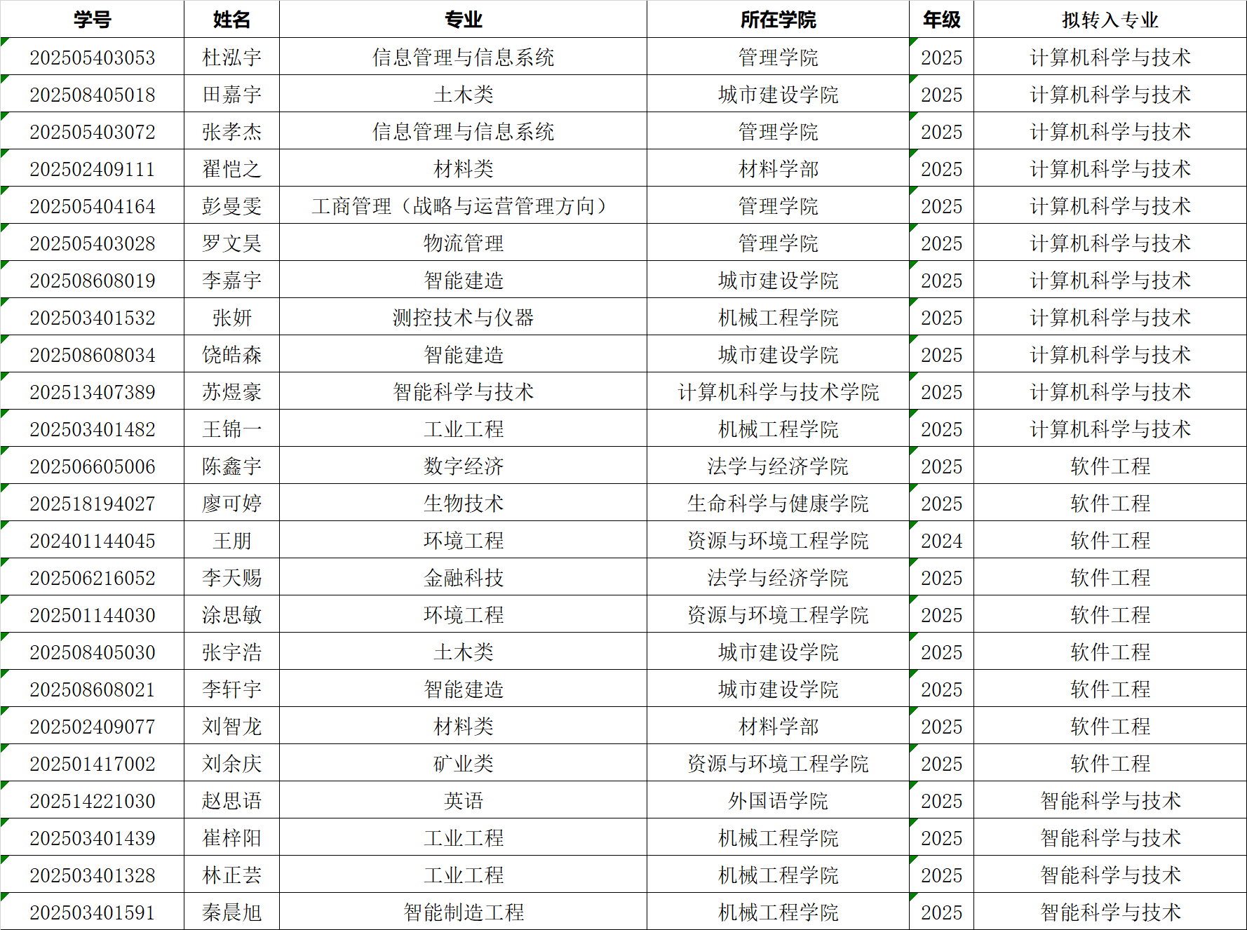 根据《英国365网站普通本科生专业选择与转专业管理办法》(武科大教〔2025〕31号)、本科生院《关于做好2025-2026学年普通本科生第一学期转专业考核方案的通知》和《365英国官网2025-2026学年普通本科生第一学期转专业考核方案》的有关要求,计算机学院于2025年12月26日组织了转专业PAT考试,2025年12月29日组织了转专业综合面试,对学生的专业基础知识、基本能力和专业思想情况等进行了考核。学院综合PAT考试成绩和综合面试情况,择优拟录取24人,现将拟录取名单公示如下。