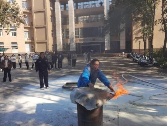 讲座后,在学院门前广场进行灭火实战演练。学院师生代表在保卫处消防科教员指导下,按照“提、拔、握、压”的方法亲手操作干粉灭火器、用灭火毯扑灭明火,提高个人消防技能。