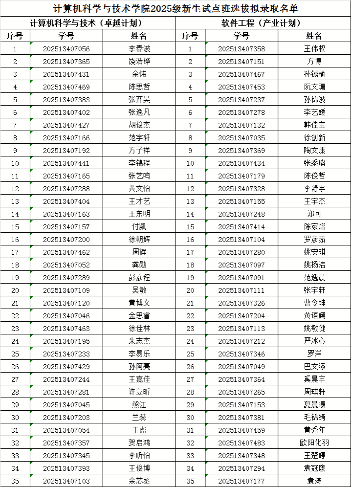 根据《365英国官网2025级新生试点班选拔考核工作安排》,学院于9月22日组织了新生试点班选拔的考试。根据学生考试成绩和学生志愿,择优拟录取35名《计算机科学与技术(卓越计划)》学生,35名《软件工程(产业计划)》学生。无特殊原因,拟录取学生不得主动申请退出!现将拟录取名单公示如下: